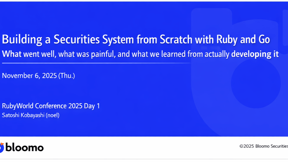 December 31, 2025 How Bloomo built a regulated trading system from scratch By Satoshi Kobayashi (noel), CTO – Bloomo Securities RubyWorld Conference 2025 – Day 1 Introduction At RubyWorld Conference 2025, Satoshi Kobayashi (小林悟史 / noel), CTO of Bloomo Securities Inc., delivered one of the most consequential Ruby case studies in recent years: “Building a … Continue reading Building a Securities Brokerage with Ruby and Go