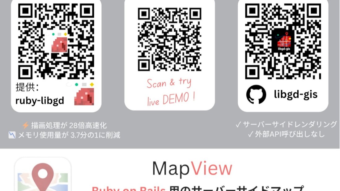 April 15, 2026 🚀 See the LIVE DEMO in action MapView Render maps directly from your backend no external APIs required. Fast, controlled, and production-ready. Try the demo → Today I created a flyer to send to Ruby on Rails Kaigi about my library stack. I strongly recommend keeping an eye on that conference. After … Continue reading Create QR Codes from Scratch with Ruby, ruby-libgd, and rqrcode