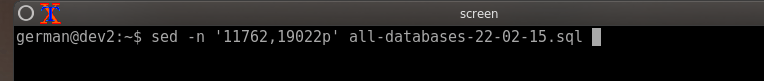 grep -n {DATABASE_NAME} all-databases-22-02-15.sql first line "BEGIN DATABASE" 11762 last line in database "END DATABASE" 19022 sed -n '11762,19022p' all-databases-22-02-15.sql mysqldump backup of all databases - BASH-DEBIAN