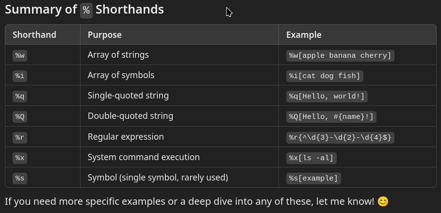 Ruby is renowned for its expressive and concise syntax, and one standout feature is its shorthand notations for creating arrays, strings, symbols, and more. If you’re a Ruby developer looking to write cleaner and more readable code, understanding these shorthands like %w, %q, %i, and others is essential.
