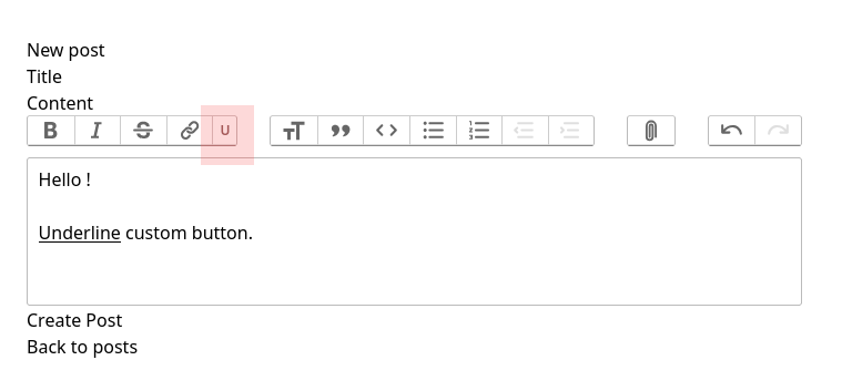 This code initializes a custom underline button in the editor, which you can click to underline text. A small tweak but a huge user experience improvement!