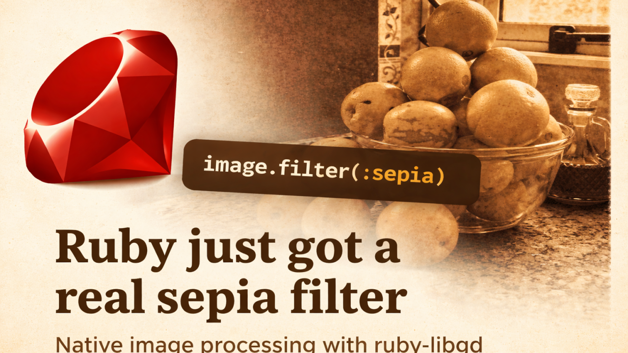I added a native sepia filter to ruby-libgd — Ruby’s new binding to the GD Graphics Library — and with it Ruby took another step toward regaining something it quietly lost over the last decade: a true raster graphics engine.