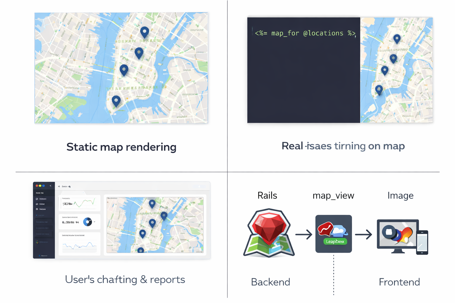 map_view renders maps entirely on the server. Your Rails app provides data (points, routes, areas) and map_view turns it into a static image during the request lifecycle. No JavaScript execution in the browser and no client-side map engine involved.