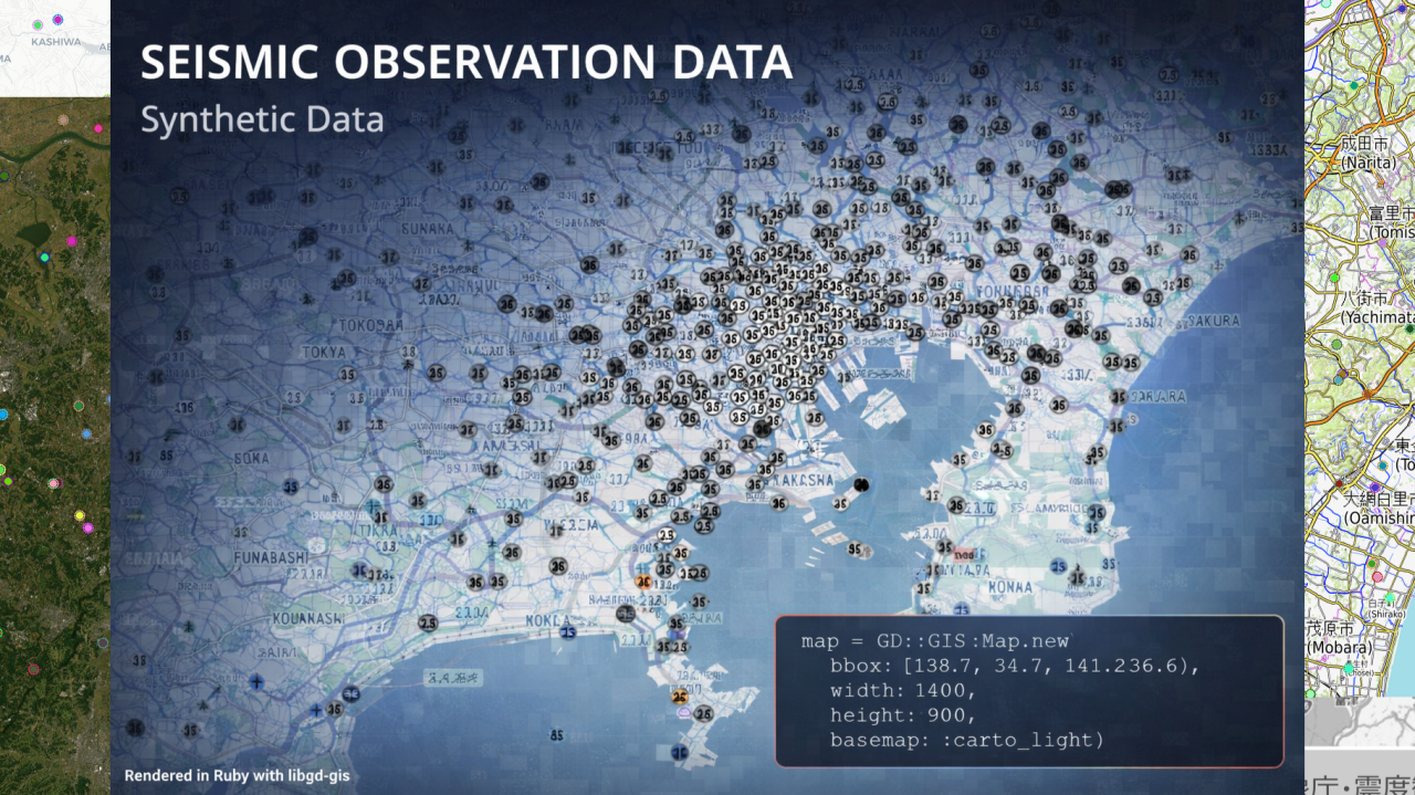 #!/usr/bin/env rubyrequire "date"require "gd/gis"require_relative "fonts"# ---------------------------------------# CONFIG# ---------------------------------------GEOJSON = ARGV[0] || "fake_jma_stations.geojson"OUT = "synthetic-seismic-#{DateTime.now.strftime('%Y%m%d-%H%M')}.png"WIDTH = 1400HEIGHT = 900# Kanto / Tokyo bboxBBOX = [ 138.7, # min lon 34.7, # min lat 141.2, # max lon 36.6 # max lat]# ---------------------------------------# MAP# ---------------------------------------map = GD::GIS::Map.new( bbox: BBOX, width: WIDTH, height: HEIGHT, zoom: 11, basemap: :carto_light)map.style = GD::GIS::Style.load("solarized")map.add_geojson(GEOJSON)map.renderimg = map.image# ---------------------------------------# LEGEND# ---------------------------------------def draw_legend(img) x, y = 30, 30 w, h = 520, 95 bg = GD::Color.rgba(0, 0, 0, 170) border = GD::Color.rgb(255, 255, 255) img.filled_rectangle(x, y, x + w, y + h, bg) img.rectangle(x, y, x + w, y + h, border) img.text( "Seismic observation data (synthetic)", x: x + 18, y: y + 34, size: 22, color: GD::Color::rgb(250, 250, 250), font: GD::Fonts.random ) img.text( "Rendered in Ruby with libgd-gis", x: x + 18, y: y + 66, size: 14, color: GD::Color.rgb(180, 220, 255), font: GD::Fonts.random )enddraw_legend(img)# ---------------------------------------# OUTPUT# ---------------------------------------img.save(OUT)puts "✔ image generated: #{OUT}"