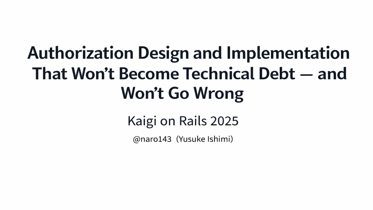 At Kaigi on Rails 2025, Yusuke Ishimi presented a practical architecture for permission management designed to remain correct as systems evolve. The talk, titled “Designing and Implementing Authorization Without Technical Debt,” focuses on building authorization that is explicit, testable, and resilient to business change. 権限管理の設計と実装