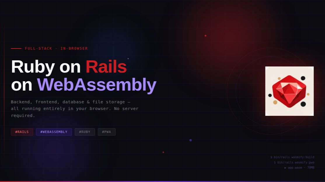 WebAssembly (Wasm) makes this possible. By compiling Ruby and Rails into a Wasm module, the entire application stack executes client-side. This post explores a practical journey: from scaffolding your Rails app to shipping it as a Progressive Web App (PWA) that runs entirely offline.
