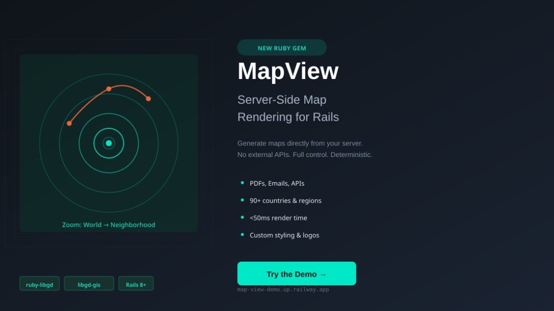 MapView: Server-Side Map Rendering for Rails April 12, 2026 After an extensive development journey, MapView has arrived: a powerful API for generating map images directly from your Ruby server. What is MapView? MapView is a Ruby gem that enables you to render maps, routes, points, and polygons with zoom levels ranging from a global world … Continue reading MapView: Server-Side Map Rendering for Rails