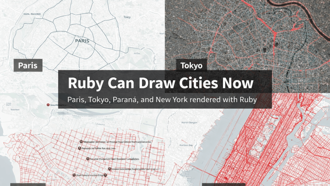 January 9, 2026 How I built a pure-Ruby GIS engine that renders Paris, Tokyo, New York, and more Most people don’t think of Ruby when they think about maps, GIS, or visual computing. If you want to draw a real city, the standard stack usually looks like: QGIS PostGIS Mapnik Mapbox or a heavy JavaScript … Continue reading Ruby Can Draw Cities Now