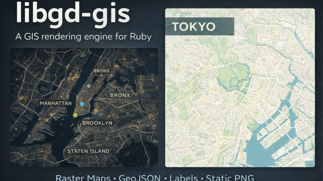 January 23, 2026 Raster maps, GeoJSON overlays, and real-world cartography — without leaving Ruby. Over the last months, I’ve been working on libgd-gis, a GIS rendering engine built on top of libgd and designed specifically for Ruby developers who need static map generation without relying on browser-based toolchains or heavyweight GIS stacks. This article walks … Continue reading libgd-gis: A Practical GIS Rendering Engine for Ruby
